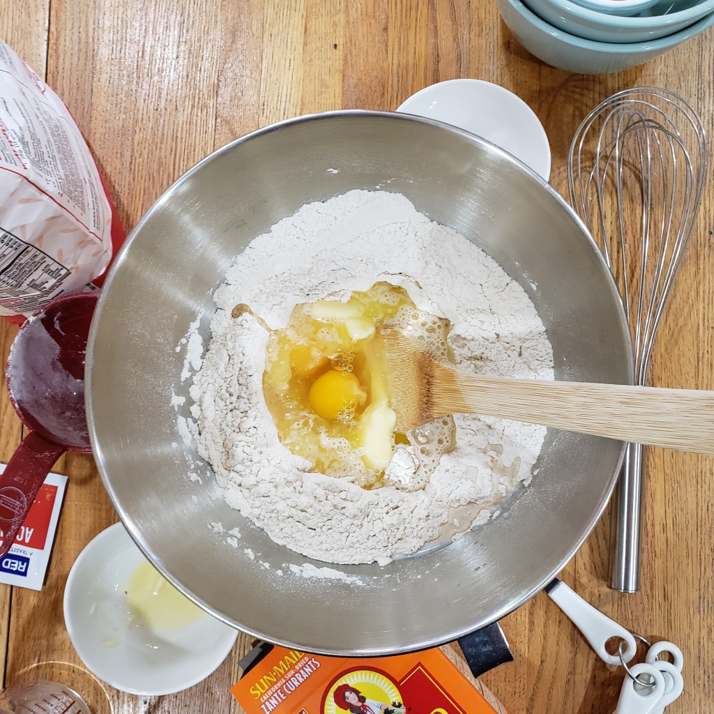 Step 3: Make a well. Essentially you’re digging a hole in the middle of the ingredients you just mixed. Once that well is formed, add in that frothy yeast stuff we made in step 1, along with butter, eggs, and the rest of the milk. This is gonna get sticky. If you’re using a mixer, turn it on. If mixing by hands, give your biceps and triceps a good stretch.