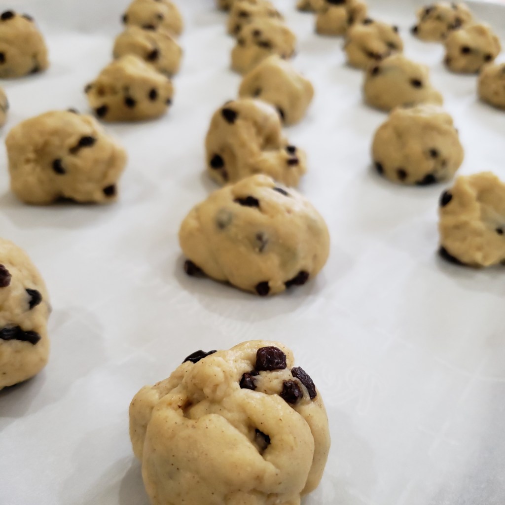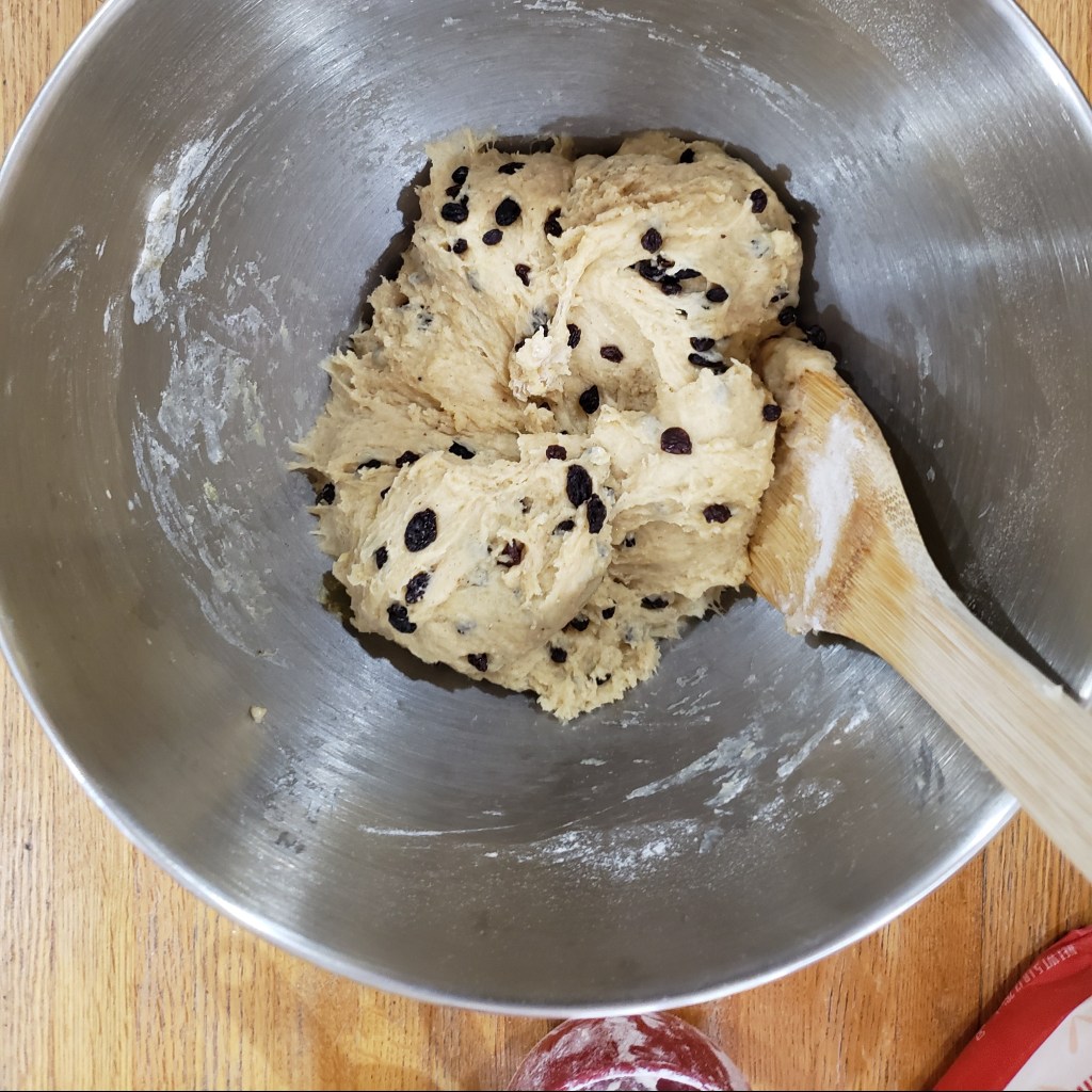 Step 4: Add the fruit. We used currants, and some lemon zest, but you can use pretty much any kind of dried fruit you want. Make sure it’s dehydrated in some form in order to keep the water content down. Fold it into the dough and mix well.