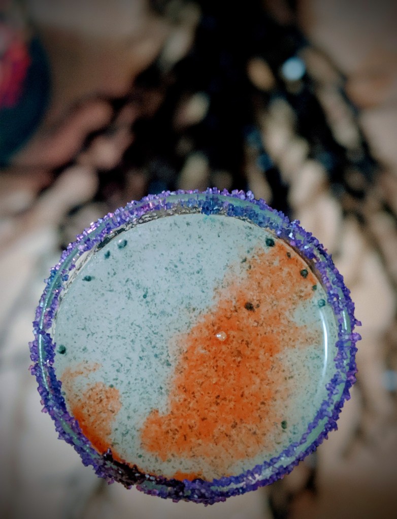 1. In a small bowl, combine coconut cream and a few drops of food dye. Stir to combine, and the add a small spoonful of the mixture to the bottom of a glass (if you are adding a sugar rim, do that before this step).