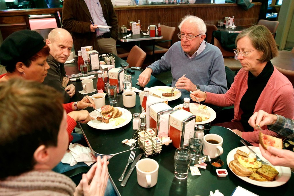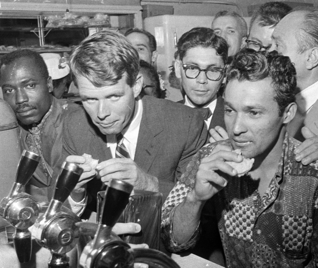 Robert Kennedy, managing his brother’s presidential campaign, stops for a snack at a restaurant in Spanish Harlem. Other diners crowd around.