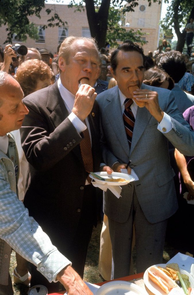 During the election campaign, American President Gerald Ford and his running mate Bob Dole eat hot dogs at a photo opportunity in Dole’s hometown, Russell, Kansas, Augist 1976. (Photo by Dirck Halstead/The LIFE Images Collection/Getty Images)