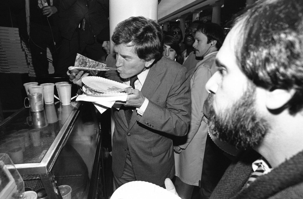 Sen. Gary Hart bites into a slice of pizza while on the campaign trail in Bostonís historic Faneuil Hall district, Monday, March 5, 1984. (AP Photo/George Whitney)
