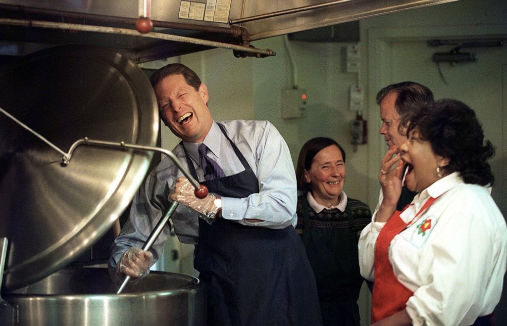 WASHINGTON, : US Vice President and presidential candidate Al Gore(L) laughs as he stirs a vegetable stew as volunteer Veronica Park(2nd-L), Rep. Tony Hall, D-OH, and volunteer Olivia Ivy(R) look on during food preparation for the homeless as part of World Hunger Day 15 October 1999 at Martha’s Table in Washington, DC. AFP PHOTO/Mario TAMA (Photo credit should read MARIO TAMA/AFP/Getty Images)
