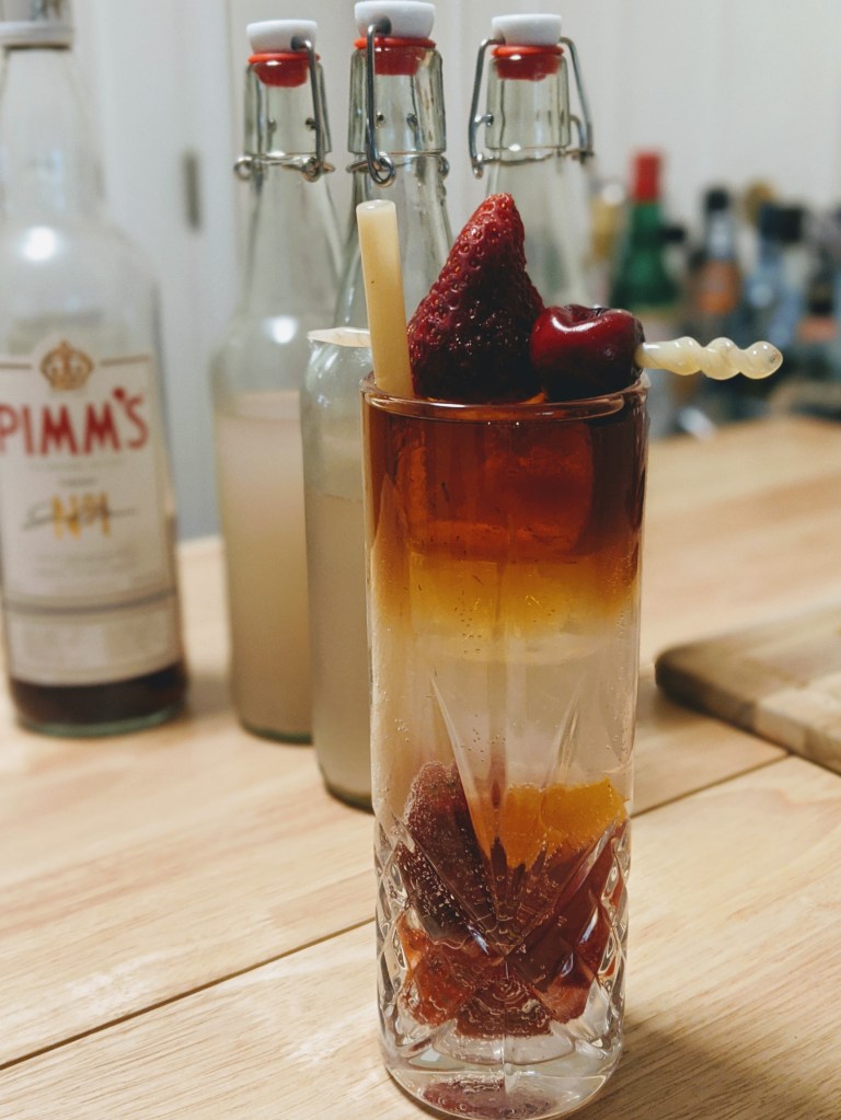 - Add Pimm’s No. 1 and gin to a glass filled with ice.